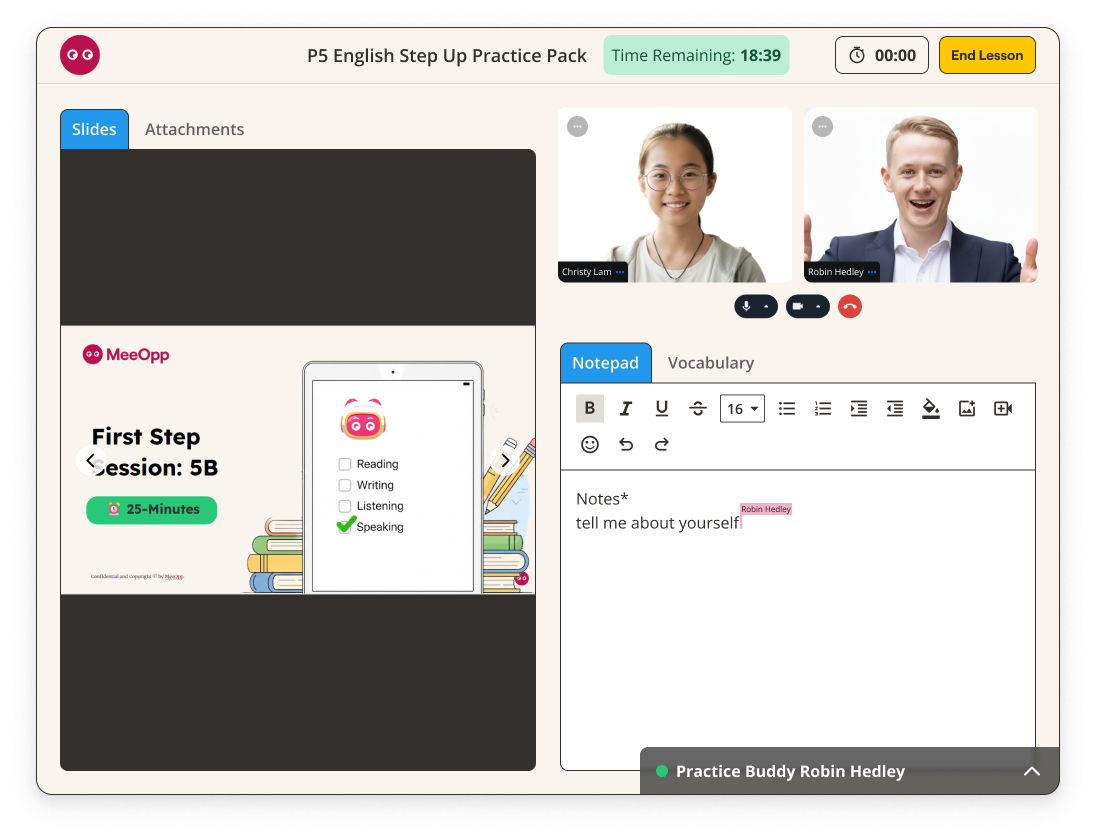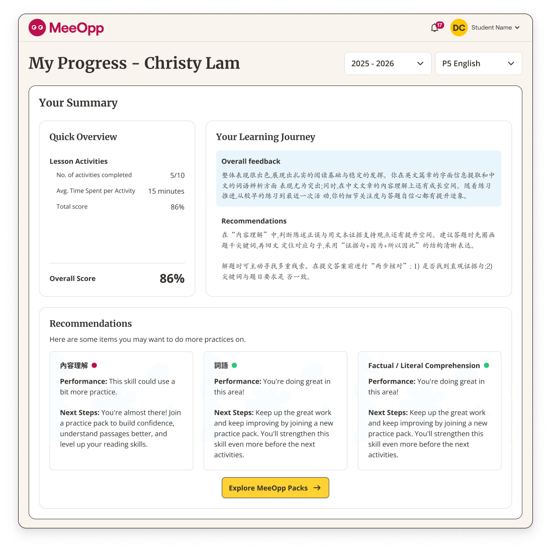 小五是學生鞏固英語根基,為呈分試及未來升中鋪路的關鍵時刻。不少學生在面對艱深的課程時,往往缺乏一對一的的指導。MeeOpp 躍升計劃:小五英文精英特訓課程,為提升孩子的英文學習能力,給予關鍵支援!我們的八星期密集課程緊貼香港小學課程,全面涵蓋必備知識,重點提升應試技巧及日常英語運用。結合每週一對一線上教學、AI 智能評估及互動練習,精準分析強弱項,幫助學生迅速提升英語能力。